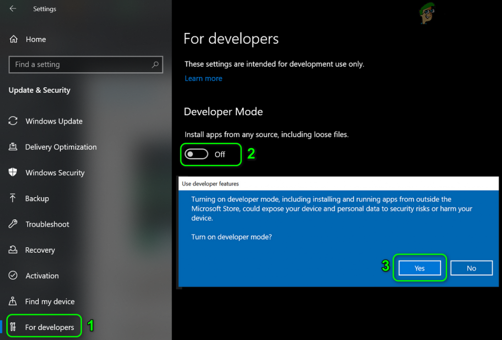 - Then enable the option of Developer Mode by toggling its switch to the on position and then confirm to enable the Developer Mode.