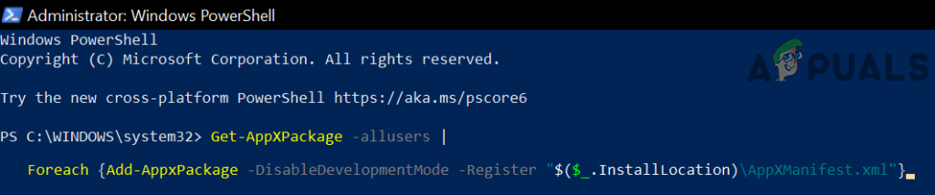 Get-AppxPackage -AllUsers| Foreach {Add-AppxPackage -DisableDevelopmentMode -Register “$($_.InstallLocation)\AppXManifest.xml”} - Now reboot your PC and upon reboot, check if the Microsoft Store issue is resolved.