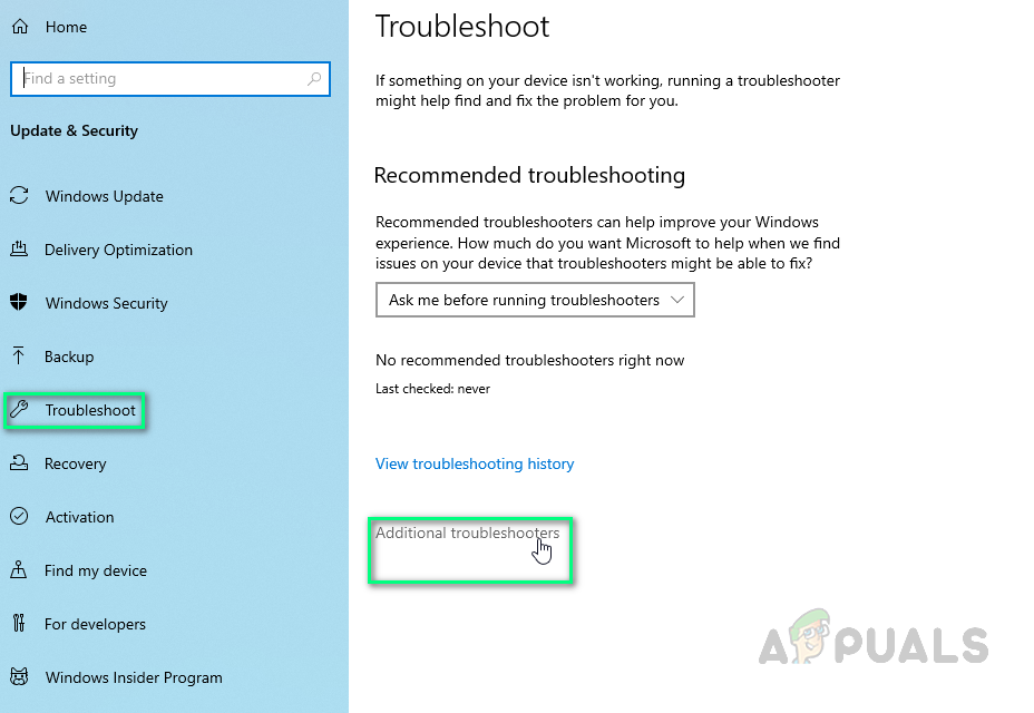 Update & Security.in Windows Settings - Then, in the left half of the window, choose Troubleshoot and click on Additional Troubleshooters (in the right half of the window).