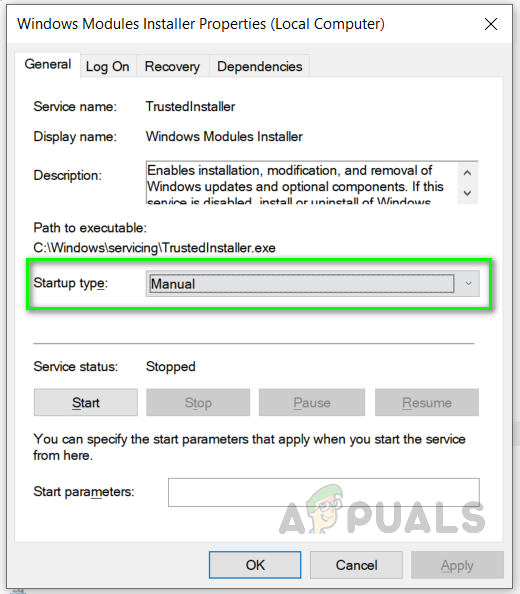 - Once restarted change the Windows Module Installer Startup Type to Automatic.