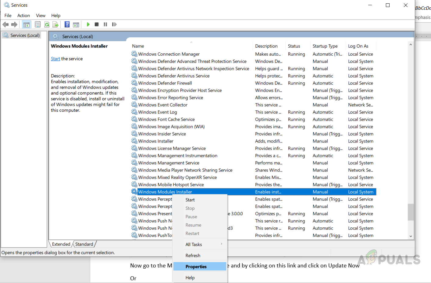 Open Windows Services - Find the Windows Module installer Service and double click on it to open the properties
