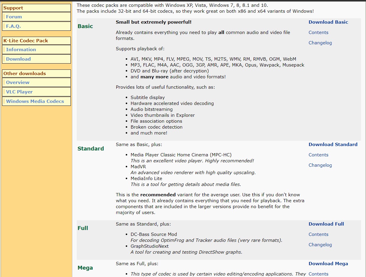 K-Lite Codec Packages - Download the codec pack according to your requirements.