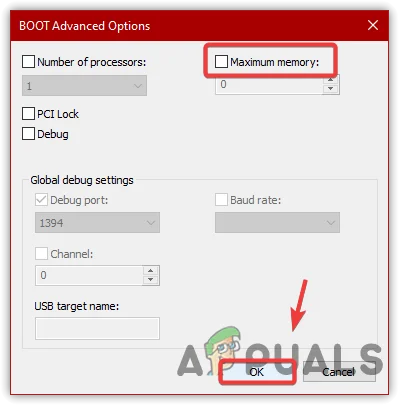 - Uncheck the Maximum memory box and click OK.