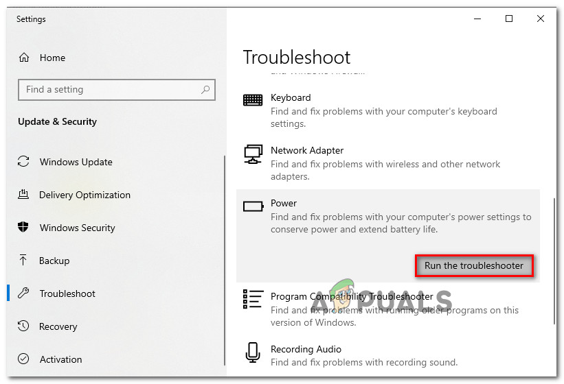 Launching the Power troubleshooter - Press the Run option. Power Troubleshooting will take some time to detect the issue.