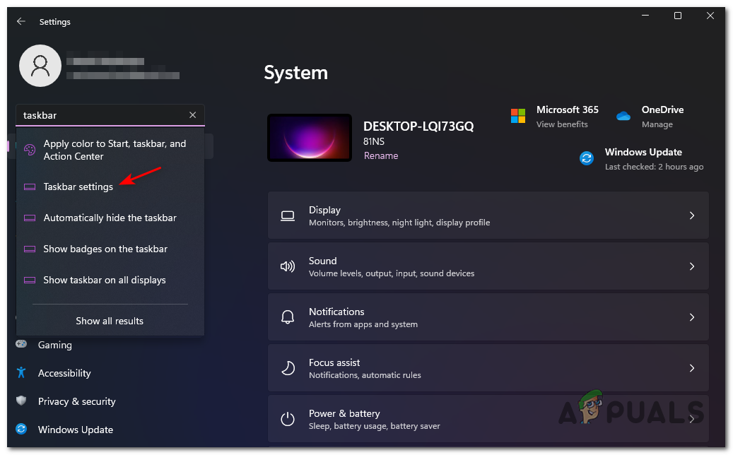 - Next, from the list of suggestions, click on Taskbar Settings.