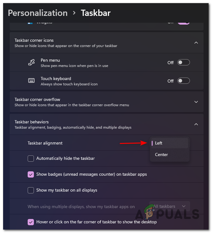 Accessing the Taskbar settings screen - Next, expand the drop-down menu associated with Taskbar behaviors and change the value of Taskbar alignment from Center to Left.