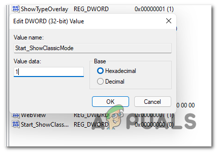 - The default value of Start_ShowClassicMode will be 0 (Disabled) – In order to actually enforce the classic start menu, you need to change the value data to 1 and click on Ok to save the changes.