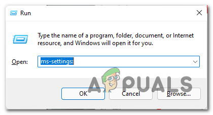 - Press Windows key + R to open up a Run dialog box. Next, type ‘ms-settings:’ inside the text box and press Enter to open up the Settings app on Windows 11.