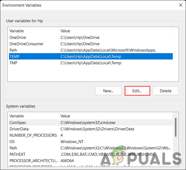 Click on editing the environmental variable - Locate the TEMP variable and click on the Edit button in the dialog.