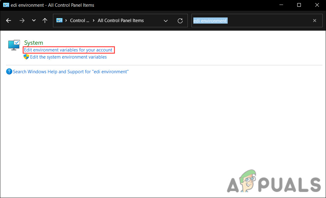 - Type Environment variables in the search bar at the top and click on Edit environment variables for your account from the search results.