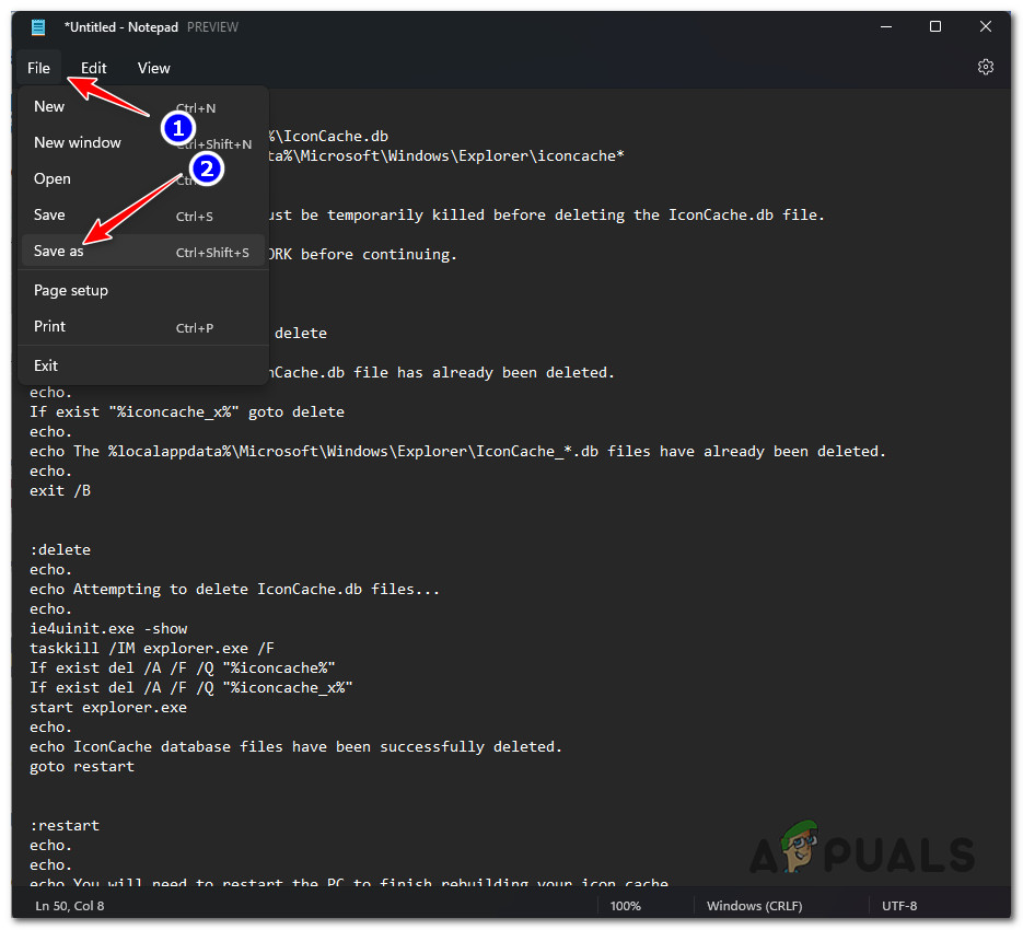 Rebuilding the icon via BAT file - Click Save to create the file, then close Notepad.