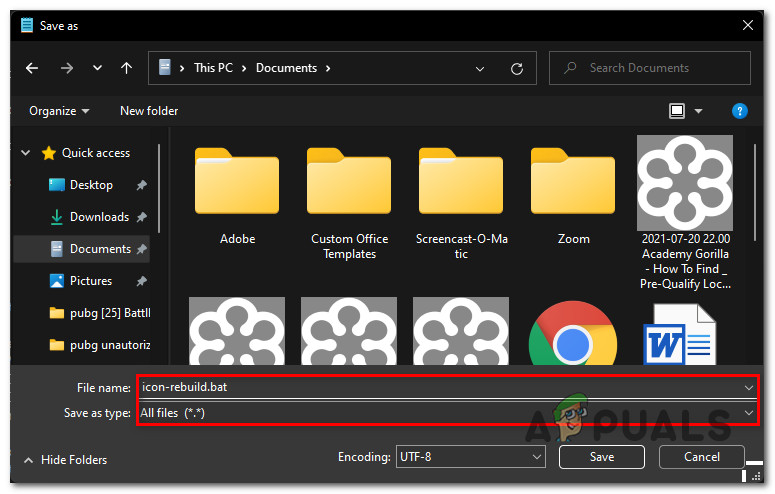 Creating the BAT file to rebuild the icon cache - In the Save as menu, navigate to your desired save location, change the Save as type to All Files, and ensure the filename ends with the ‘.bat’ extension.