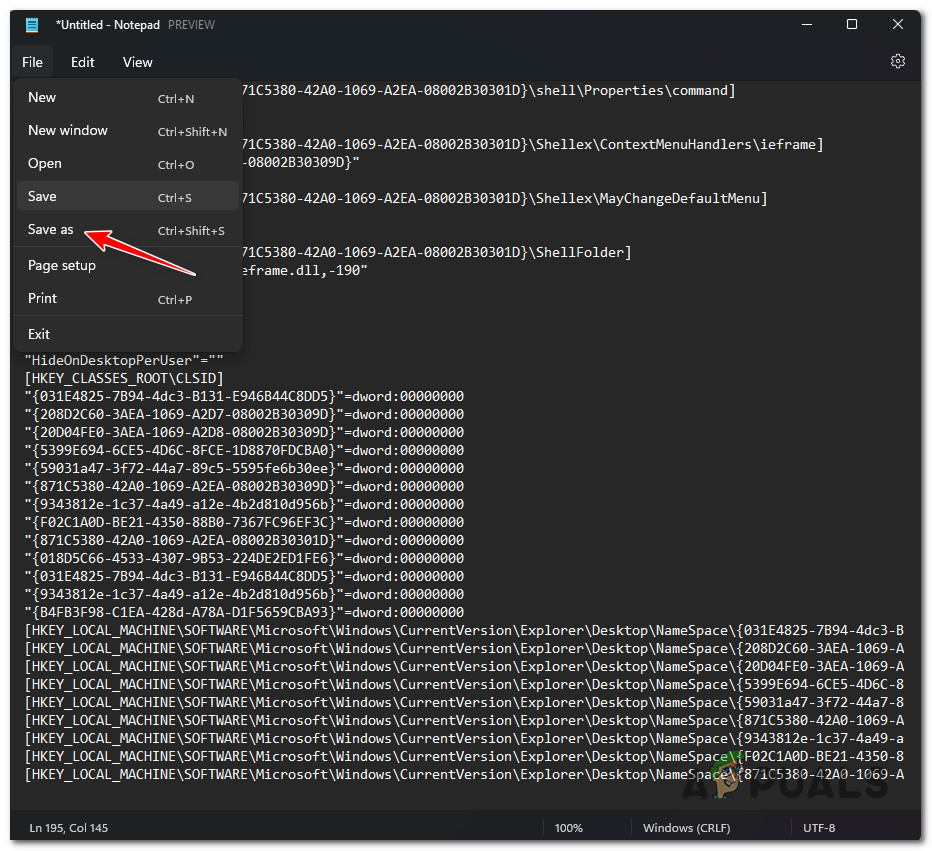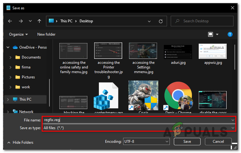 Saving the Notepad file as - In the Save as menu, navigate to where you want to save the REG file, ensure to set Save as type to All Files, and ensure the filename ends with the ‘.reg’ extension.