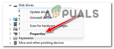 - After that, from the context menu, right-click the SSD disk in the Disk Drives section and select Properties.