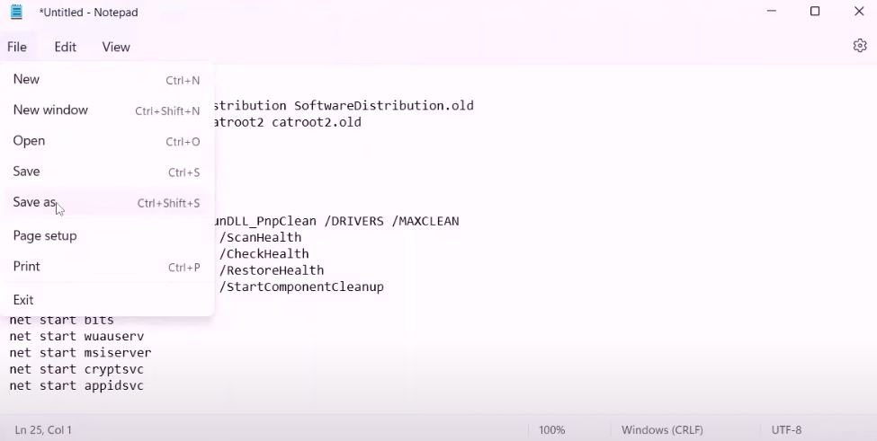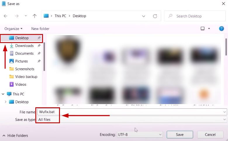 - Set the file name to Wufix.bat and set the type to All Files.