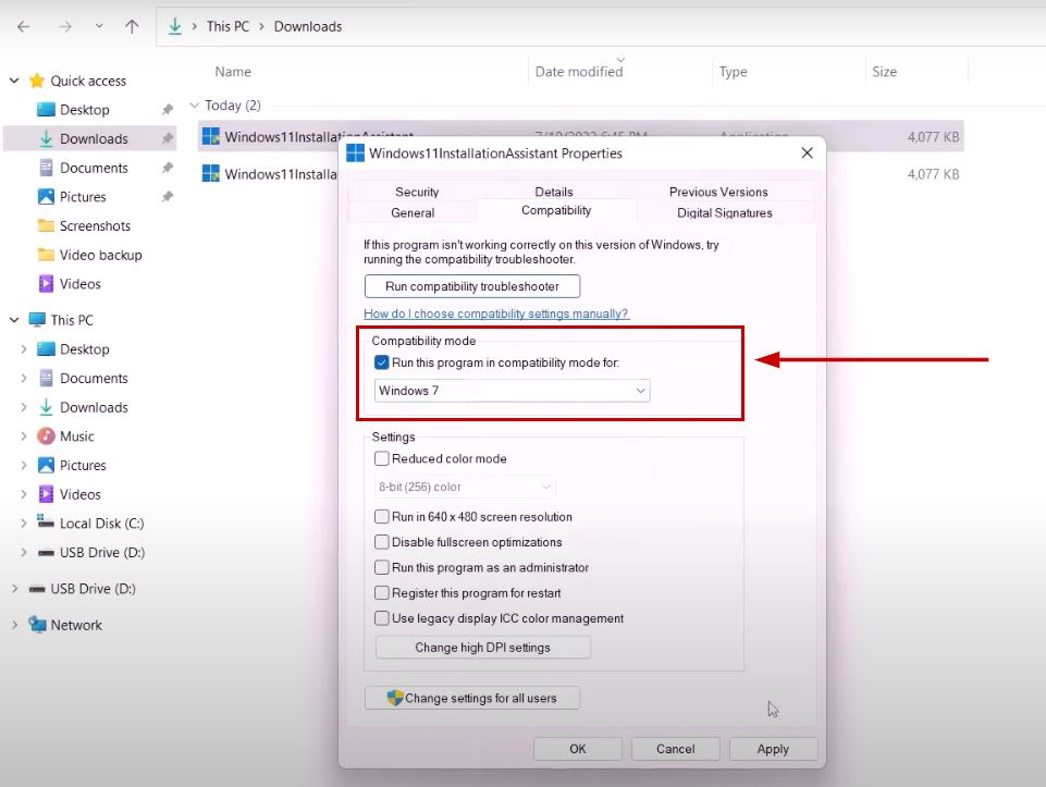 - Select Run this program in compatibility mode for and select Windows 7.