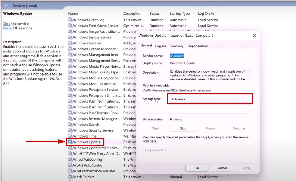 - Set Automatic as the Startup type and click on Apply.