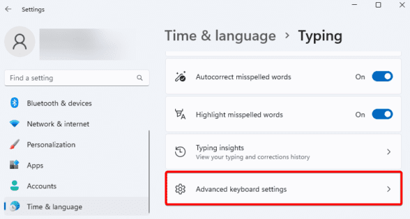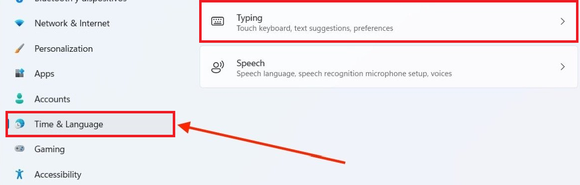 - Locate the Time & Language option and click on it. Then select Typing.