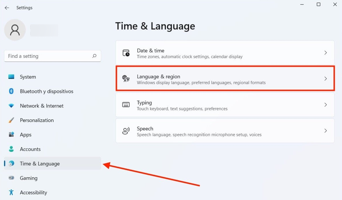 - Select the Time & Language option, then click on Language & Region.