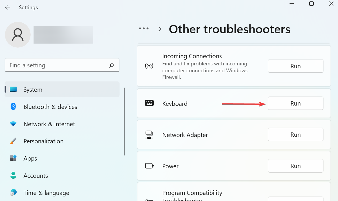 - Select the Keyboard troubleshooter and click the Run button adjacent to it.