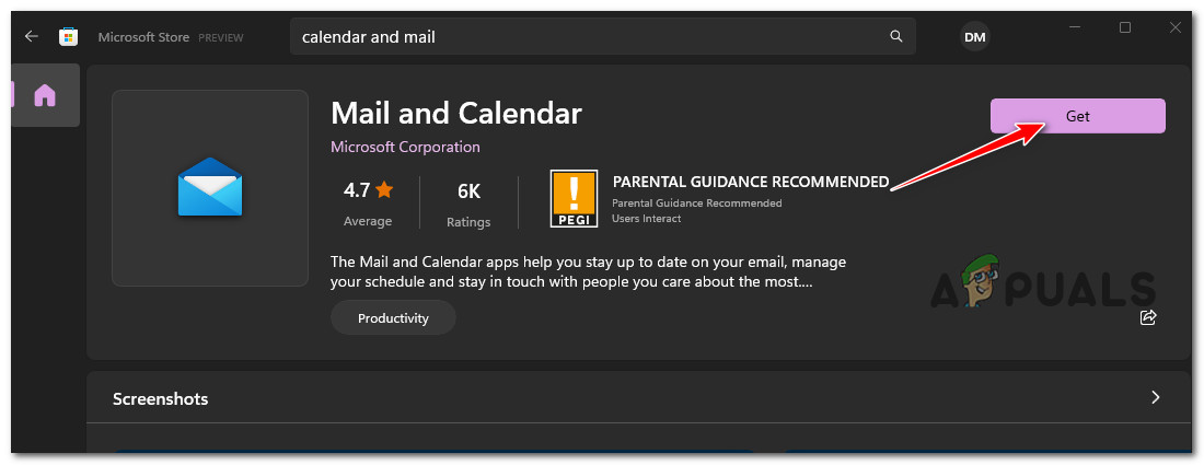 - From the list of results, click on the Mail and Calendar app, then click on the dedicated Get button.