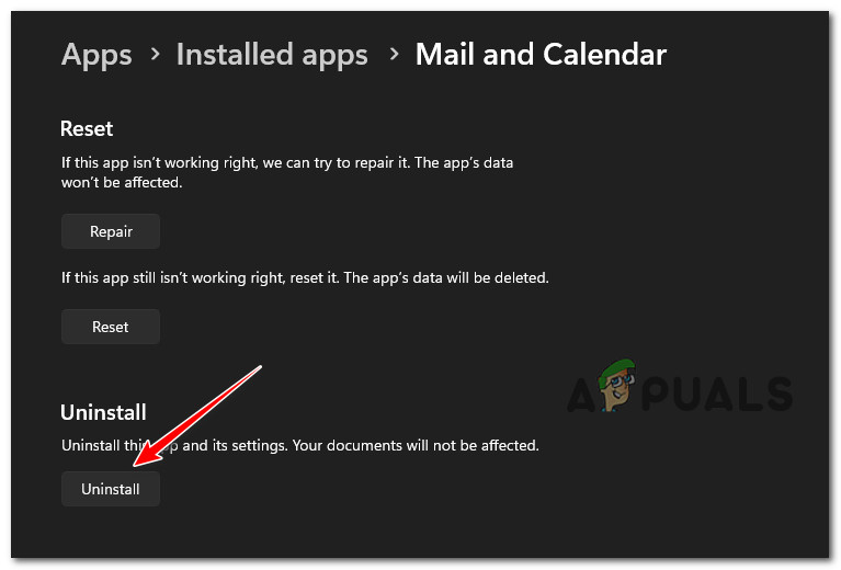 If the reset and repair procedure above didn’t produce the desired results, you should also try reinstalling the entire Mail and Calendar component from the Installed Apps tab of the Settings menu.