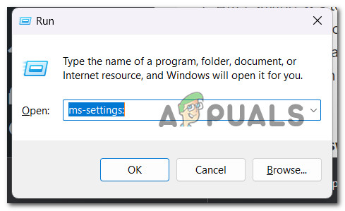 - Inside the newly appeared run box, type ‘ms-settings:’ and press Ctrl + Shift + Enter to open up the Settings menu with admin access.