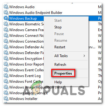 - The Windows Backup service is Disabled – According to a lot of affected users, you can expect to see this issue occurring because the main service that is supposed to be handling this task is disabled (Windows Backup). In this case, you can resolve the issue by accessing the Services screen and enabling the Windows Backup service.