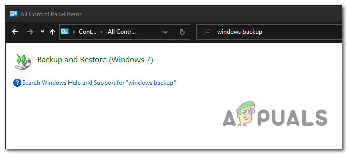 - Inside Control Panel, use the search function (top-right section) to search for ‘windows backup‘. Then, from the list of results, click on Backup and Restore.