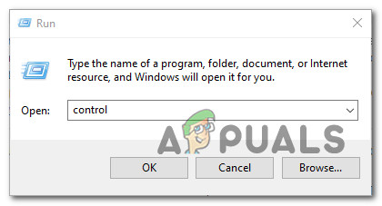 - Press Windows key + R to open up a Run dialog box. Next, type ‘control’ inside the text box and press Enter to open up the Classic Control Panel interface.