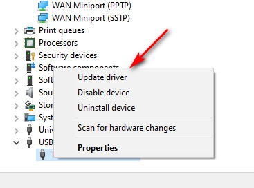 - Inside the USB Connector Managers, right-click on NVIDIA USB EHCI chipset entry and choose Update driver from the context menu.