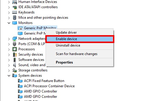 - In Device Manager, expand the Monitors section, right-click on Generic PnP Monitor, and select Enable Device.