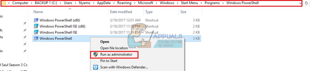 - Type ‘PowerShell‘ and then right click on ‘Windows PowerShell’ and run as an administrator.