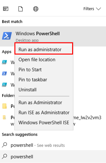 and right click on “Windows PowerShell” and run as administrator