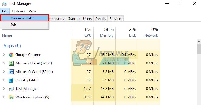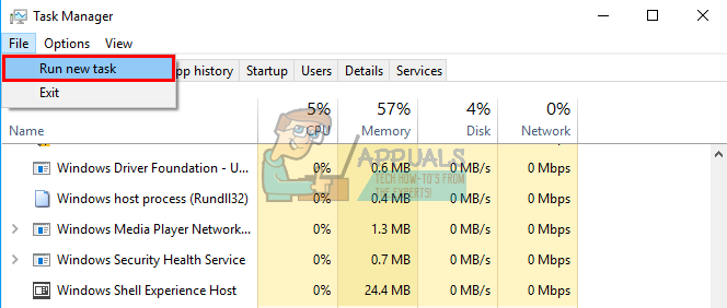 - Right click on the Start Button and select “Run” or press Ctrl + Shift + Esc to open task manager and go to File > run a new task.