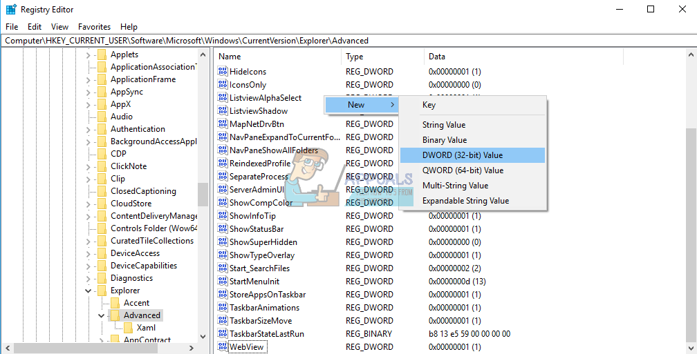 HKEY_CURRENT_USER > Software > Microsoft > Windows > CurrentVersion > Explorer > Advance