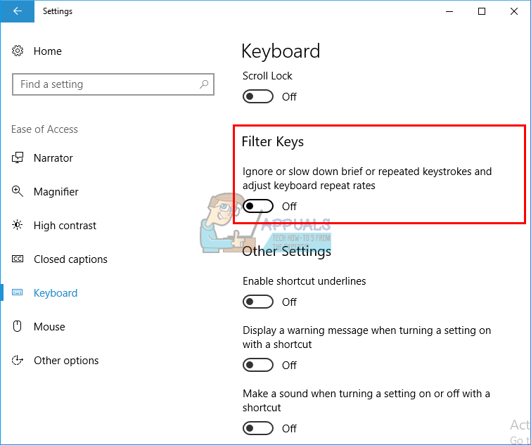 - Scroll down to ‘filter keys’ and turn it off