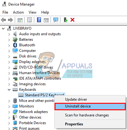 - Right click on your keyboard drivers and select ‘Uninstall device’