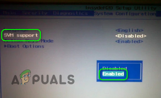 - In the Advanced tab of BIOS, enable SVM and check if the Hypervisor issue is resolved.
