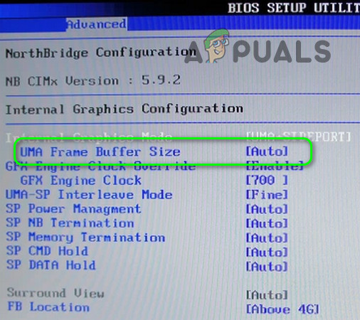 Set the UMA Frame Buffer Size to Auto - If that did not do the trick, then check if setting the UMA Frame Buffer Size value to 512 resolves the issue.