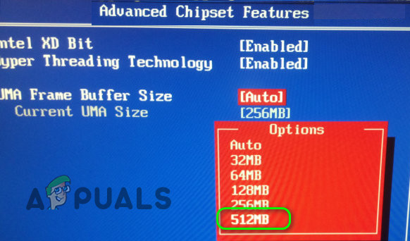 Set UMA Frame Buffer Size to 512