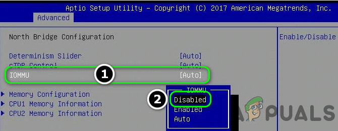 - In the Advanced tab of the BIOS, set the value of IOMMU to Disabled and then save your changes.
