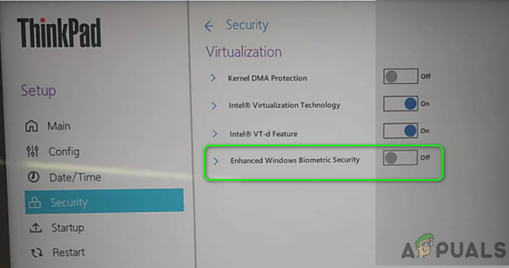 - In the Security tab of the BIOS of your system, disable Enhanced Windows Biometric Security and save your changes.