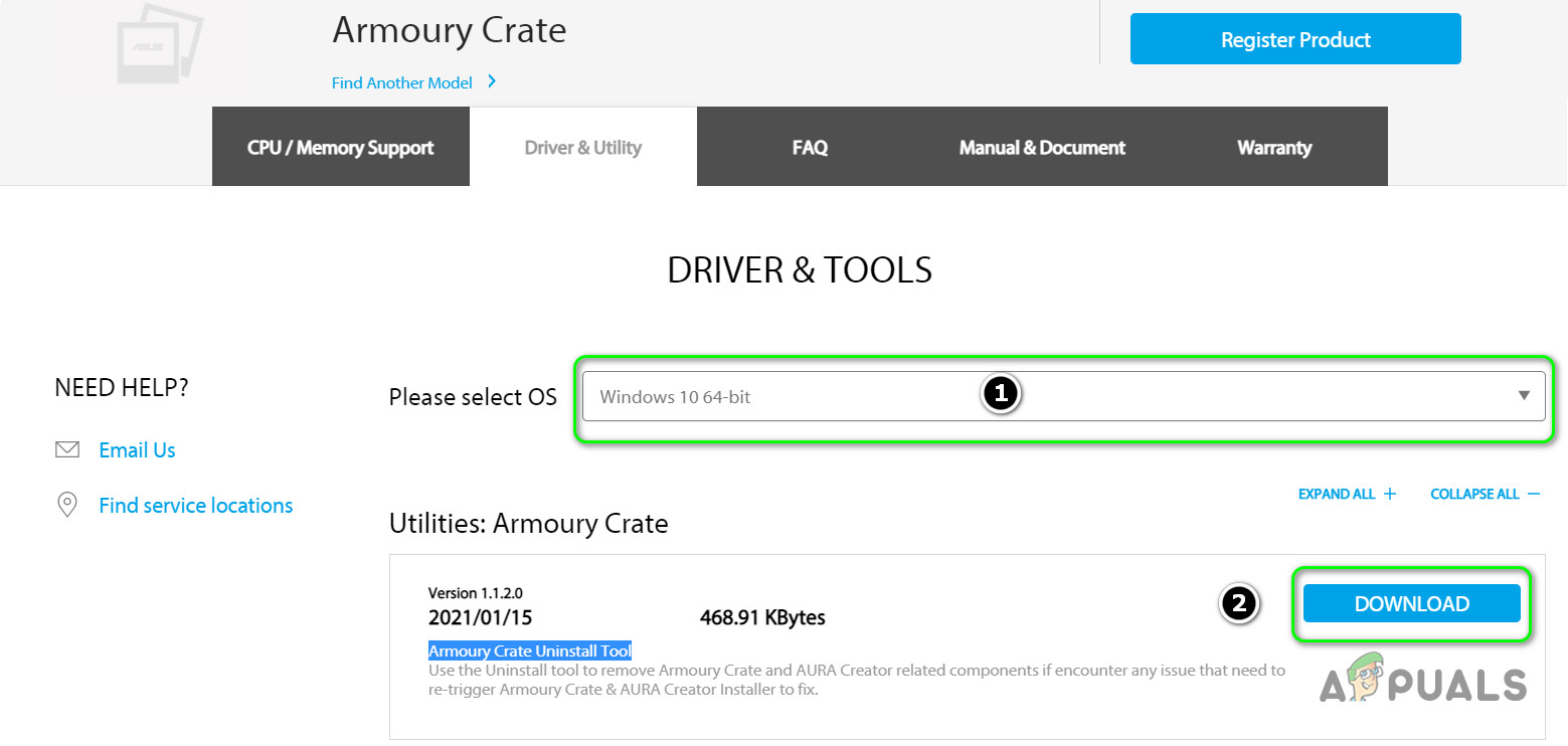 - Then, in the Driver & Utility tab, select the OS of your system in the dropdown and download the Armoury Crate Uninstall Tool.