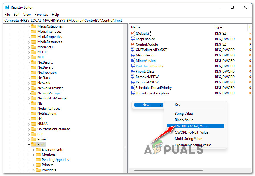 - Ensure the Print key is selected. Then, in the right-hand section, right-click an empty space and select New > 32-bit DWORD Value.