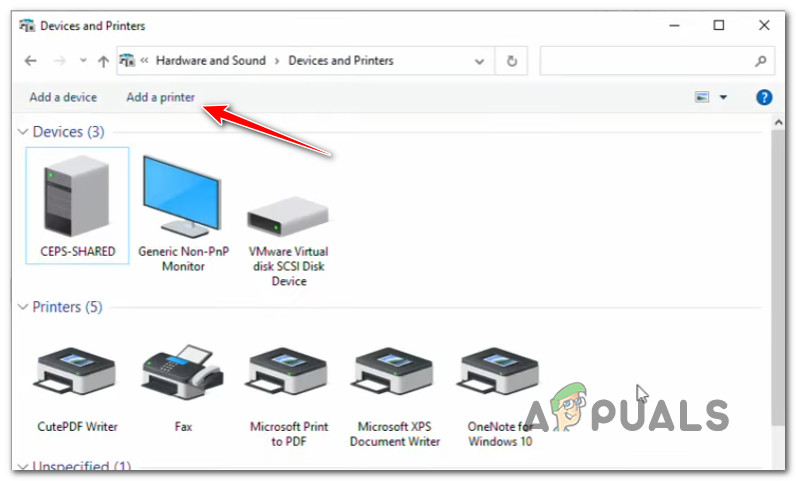 Accessing the Devices and Printers screen - In the Devices and Printers screen, click Add a printer from the ribbon bar at the top of the window.