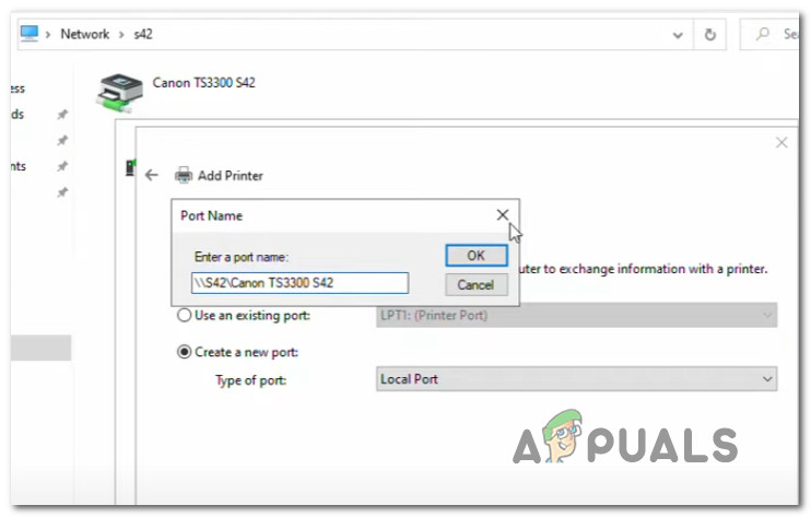 Selecting a new local port to be added - Click Next, then enter the file path followed by the name of the network printer (e.g., \\kevin\cannon 244).