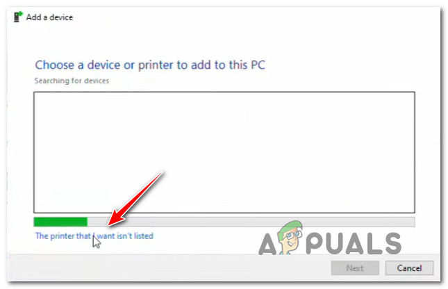 Adding a new printer driver to Windows manually - On the first screen, wait for the initial scan to complete, then click on The printer that I want isn’t listed (under the box of drivers).