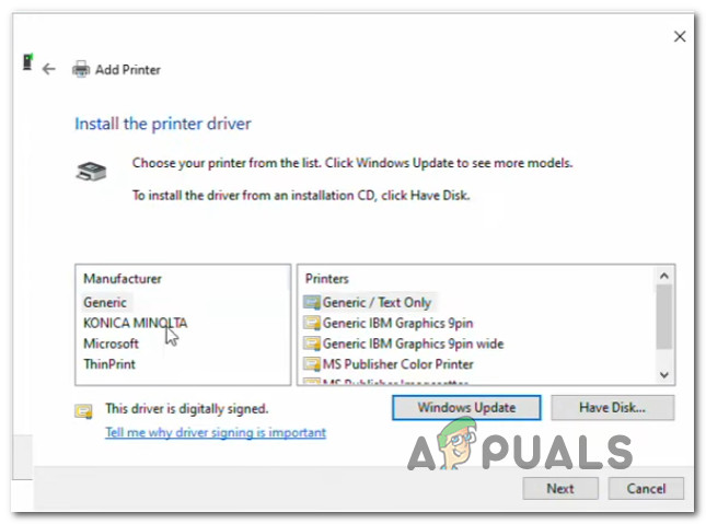 Loading the correct printer drivers Note: If the printer driver is not listed, you can download the driver locally and click Have Disk to load it from a local folder. Alternatively, click Windows Update to download all available drivers directly into this interface.