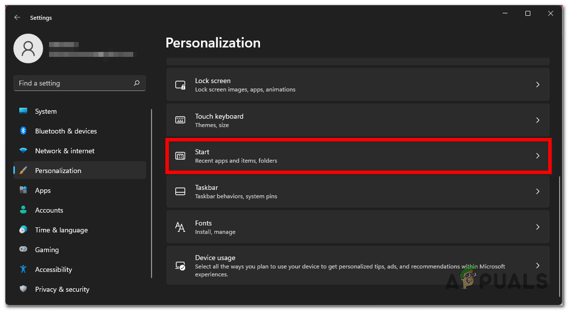 Inside Personalization accessing the Start section - Once you are inside the Start section, look for the Show recently opened items in Start, Jump Lists, and File Explorer option. When you find it, click on the toggle next to it and make sure that the feature is disabled (the button will turn grey after you disable it).